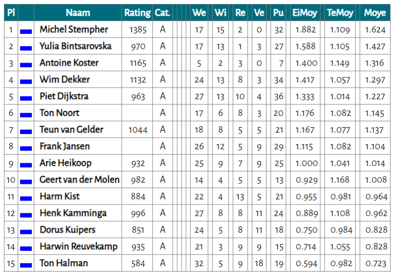 De winst en remisepartijen hielden elkaar in evenwicht. Michel Stempher ruilde vroeg naar 36 waarbij Yulia Bintsarovska op 16 terecht kwam. Schijf 16 werd weggeruild. De schijf op 36 bepaalde het verdere verloop van de partij. Yulia kwam positioneel verloren te staan maar verloor daadwerkelijk door een combinatie. Herman Brink versloeg Harm Landman, Bertus de Vries Jannes van Marle. De remisepartijen gingen naar Piet Toeter tegen Arie Heikoop, Dorus Kuipers tegen Ton Halman en Ton Noort tegen Piet Dijkstra. Michel en Bertus voeren met afstand respectievelijk groep A en groep B aan.