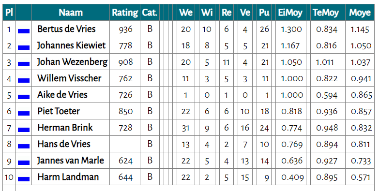 Door zelf niet te spelen kon ik de partijen beter volgen dan gebruikelijk. Harm Landman was me desondanks te snel af met zijn winst tegen Jannes van Marle, zijn eerste winstpartij dit seizoen. Nadat Dorus Kuipers op zijn vastgezette lange vleugel ook nog eens 46-41 speelde kon hij zich niet losmaken. Piet Dijkstra brak met schijfwinst door op de andere vleugel. Dorus offerde terug en gaf met 2 schijven achter op. Piet Toeter dacht gelijk te blijven maar kwam in de opening een schijf achter tegen Bertus de Vries. Daarna ontstond nog een prachtige partij waarin Piet een randschijf van Bertus isoleerde en er alles aan deed nog remise te bereiken. Bertus omzeilde de valstrikken en gebruikte in 6 tegen 5 juist de geïsoleerde schijf om via een 2 om 2 de winst definitief te maken. Na weken van tegenslag lukte het Ton Halman nu wel om goed spel ook in een goed resultaat uit te drukken. Het centrum van Ton was daarbij bepalend. Johannes Kiewiet wist de schade lang te beperken door wat ruiltjes maar moest uiteindelijk eerst één, toen twee en zelfs drie schijven verliezen om in een nadelig eindspel te komen van dam +1 tegen dam +4 van Ton. Johannes gaf wijselijk op. Ton Noort leek Herman Brink in de tang te hebben Herman had een schijf op 22 en 24 en leek geen kant op te kunnen. Ton zag op tijd dat dreigende combinaties hem noopte om zelf de boel los te ruilen. Herman ging hierna wat opportunistisch te werk en zag zijn doorbraak naar dam afgestraft met damafname en een verloren positie. De uitval van Frank Janssen naar 22 gaf heel wat hoofdbrekens aan Harwin Reuvekamp en leidde zelfs naar schijfwinst. Het bleek lastig een sluitende oplossing te vinden voor de dreigingen die Frank had ingebouwd, Frank won. Harm kist had het centrum en tempovoordeel tegen Johan Wezenberg. Waar gedacht werd dat Harm voor de winst kon gaan zag Harm zelf beren op de weg en ruilde via 3 om 3 achterwaarts. Johan bood remise aan wat geaccepteerd werd. Waar Arie Heikoop in het middenspel beter leek te staan wist Henk Kamminga dit geleidelijk om te buigen. Henk bereikte schijfwinst, kwam als eerste op dam, rekende en rekende maar moest toch in remise berusten.