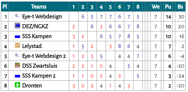 De uitwedstrijd tegen Eye-t Webdesign 2 werd geen succes. Michel Stempher en Rick Hakvoort kwamen in een snelle partij remise overeen. Rienk van Marle was met een flankaanval een maatje te groot voor Teun van Gelder. Het tweede punt werd binnen gehaald door Henk Kamminga met zijn remise tegen Erik Bakker. In de laatste partij werd de achterstand niet teniet gedaan. Yulia Bintsarovska tegen Maikel van den Esker werd ook remise. 5-3 verlies.